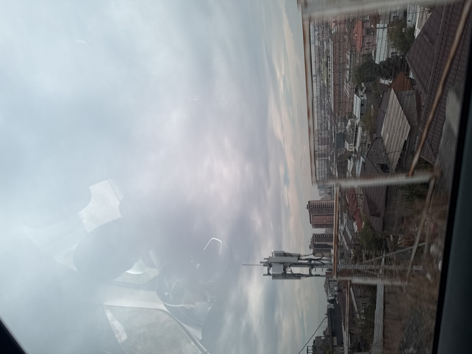 The image displays an elevated urban landscape in Yerevan, Armenia, under an overcast sky. The photograph was taken from inside a vehicle, evidenced by reflections of the car's interior, including a steering wheel and dashboard, visible in the upper-left quadrant. In the foreground, a multi-bar metal fence, appearing rusty, stretches horizontally across the lower-mid portion of the frame, partially obscuring the view. Below the fence, a dry, sparse terrain with vegetation is visible. The midground reveals a dense residential area composed of numerous houses with varied roof designs, predominantly tiled or metal. A prominent, light-colored cellular tower with multiple antennae stands on the left side, rising above these houses. Behind the immediate residential structures, several multi-story apartment buildings, some with a reddish-brown hue, are visible. To the right, low-rise industrial or warehouse-type buildings with distinct rooflines are present. The background features distant hills or mountains, partially obscured by atmospheric haze, beneath the uniformly grey, cloudy sky. No individuals are explicitly visible. The scene captures a static urban overview on an overcast day.