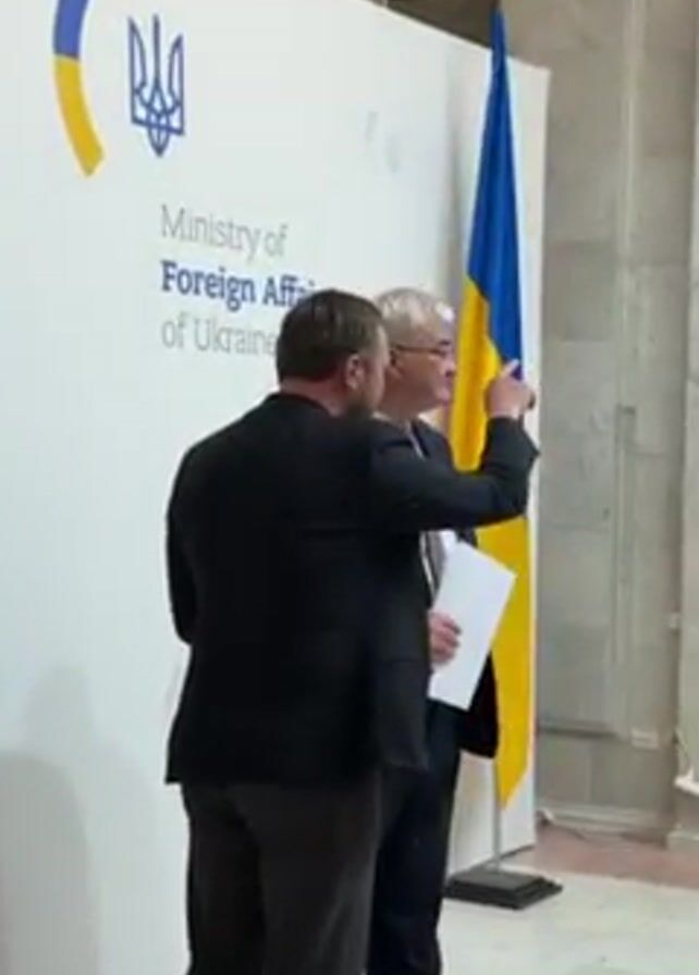 In a brightly lit room with high ceilings and ornate molding, two men in suits stand in front of a backdrop featuring the logo of the Ministry of Foreign Affairs of Ukraine and the Ukrainian and Estonian flags
