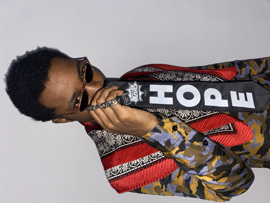 A person is pictured wearing sunglasses and holding a black strap with "HOPE" in white letters. The strap has "KHAIL" printed on it as well. They are wearing a colorful shirt with a red, white, and black patterned collar. A silver chain adorns their hand, and their hair is short and dark. The background appears to be a plain white wall.