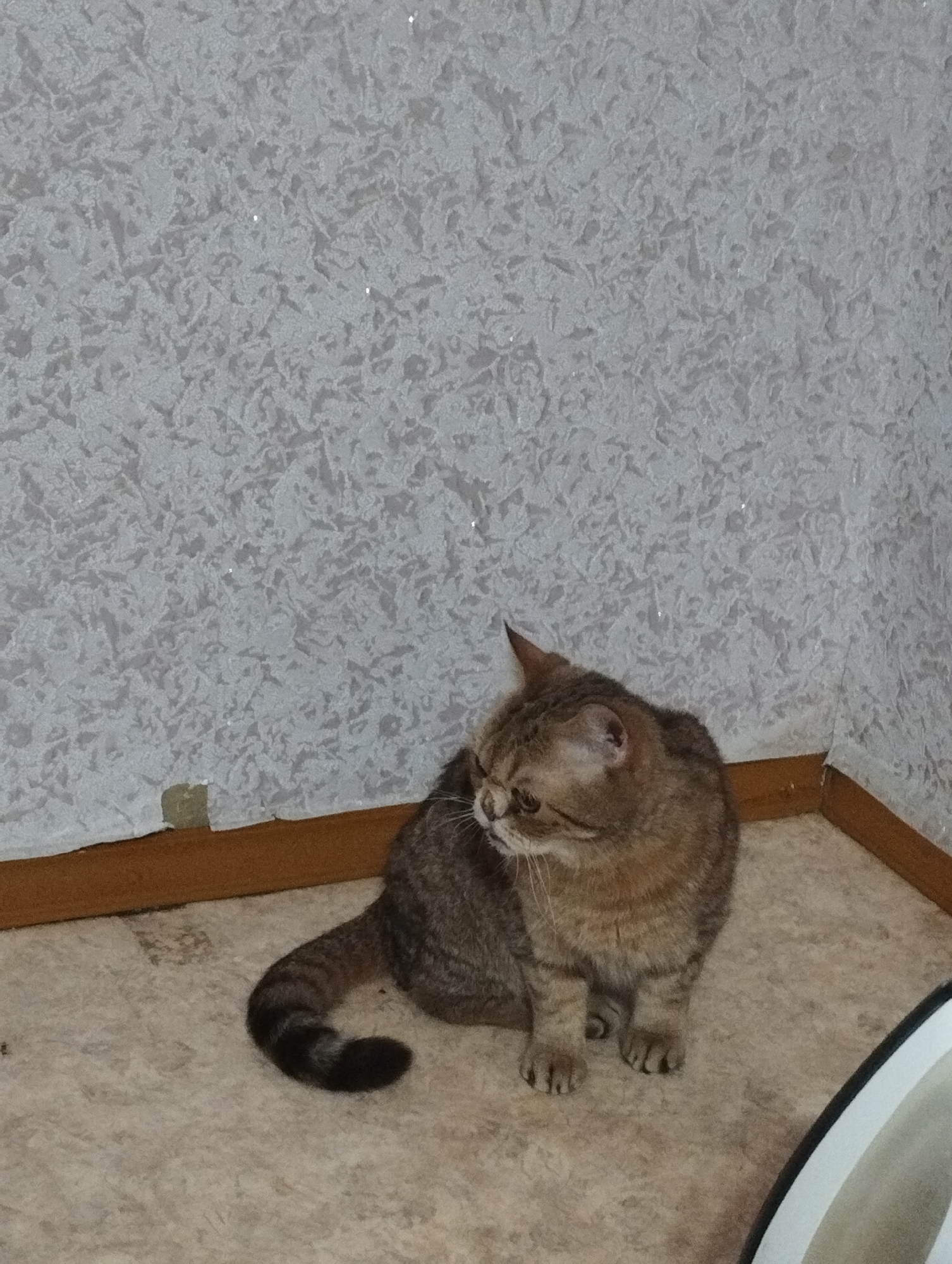 A medium-sized, tan-and-brown tabby cat sits on a light-beige floor near a wall. The wall is covered with a white, textured wallpaper with a light-gray pattern and is bordered at the bottom by a brown trim. The cat has a short, rounded face, slightly folded ears, and is looking to its left. Its tail is curled around its body, and its paws are visible in front of it. A white object with a black trim is partially visible in the lower right corner. The image appears to be taken indoors in a corner of a room. The location of Saratov, Russia, is not evident from the image.