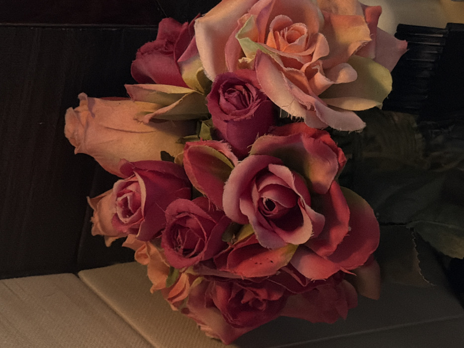A cluster of artificial roses dominates the image