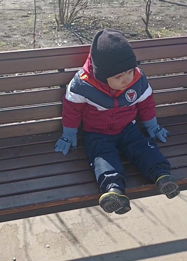 A young child sits alone on a brown park bench. The child is wearing a black beanie, a red, white, and blue jacket, dark blue pants, gray gloves, and black shoes. The child's feet are not touching the ground. The background includes bare trees, a chimney, other vehicles, and a building. The sky is visible above the trees. The light suggests the time of day is mid-day. The footage appears to be recorded outdoors on a bright, sunny day.