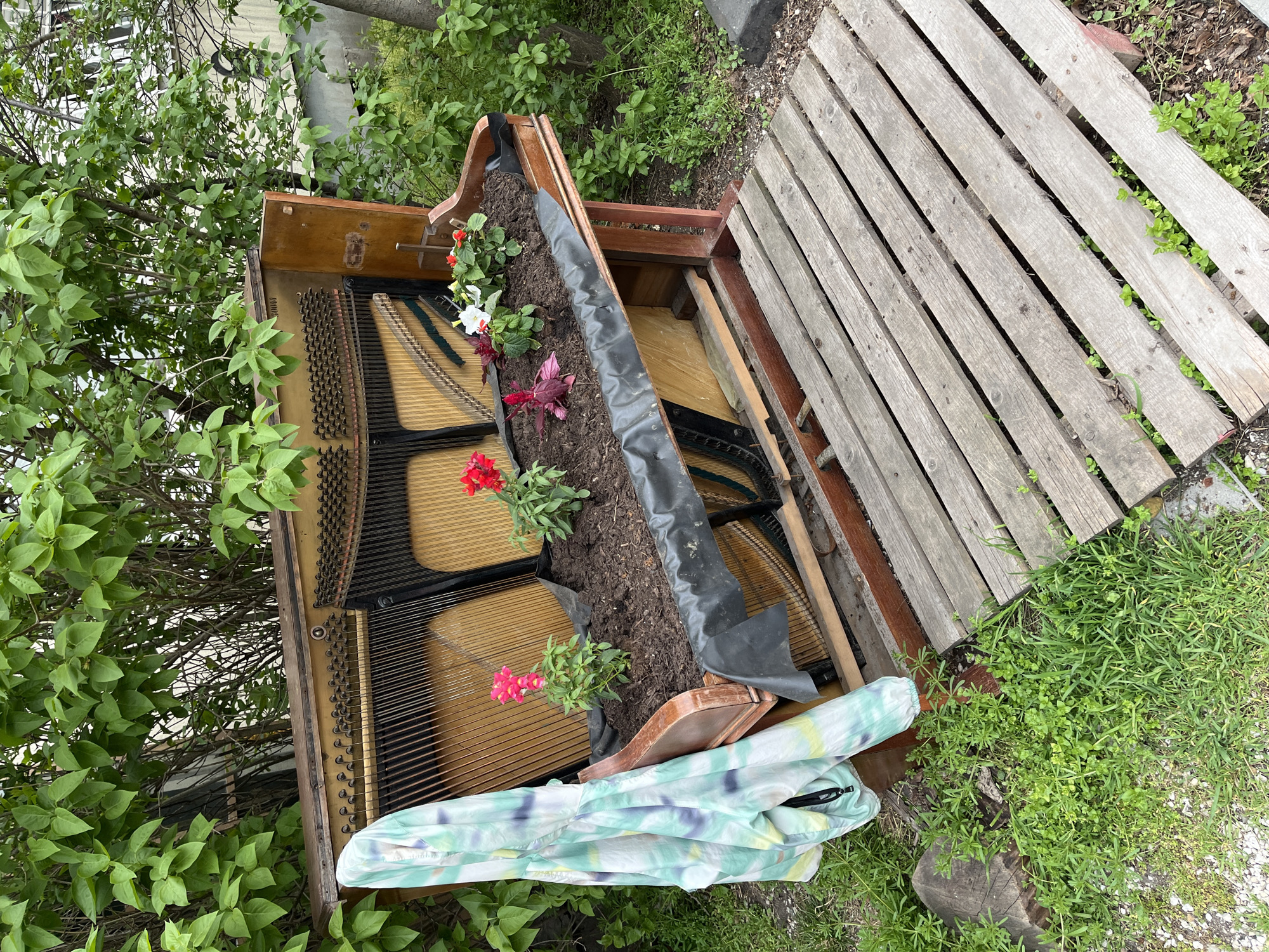 - "n upright piano that has been repurposed as a planter, located outdoors" by FM-Whr5A3, licensed under CC BY 4.0