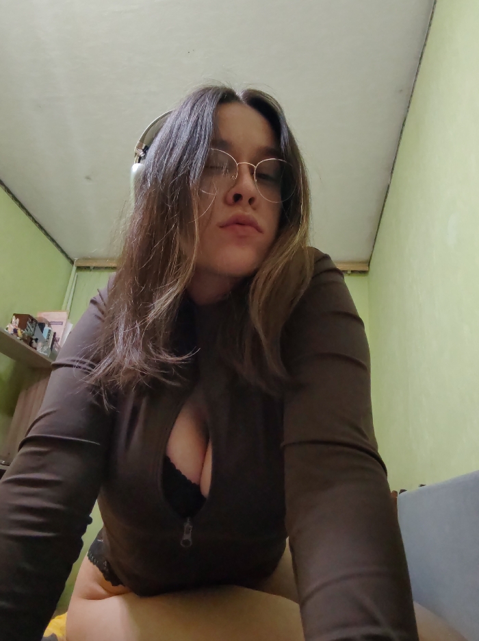 A woman poses for a low-angle selfie. She wears glasses and headphones and looks down at the camera with a slightly pouty expression. Her long, brown hair frames her face. She is wearing a brown, long-sleeved top that zips down to reveal a black bra. The background consists of a plain wall and a partially visible shelf with various objects. The overall image has a casual, intimate feel.