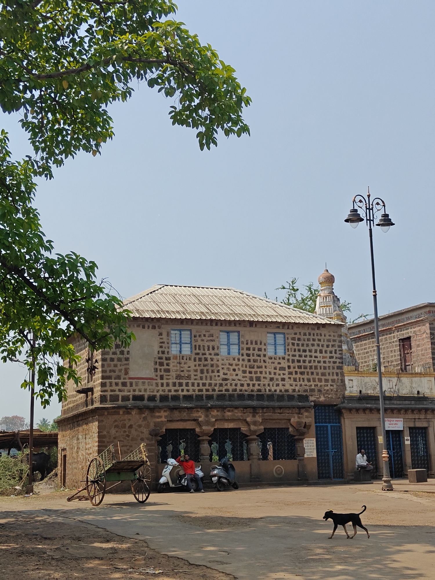 The image displays an outdoor scene in Kolhapur, India, under a clear, light-blue sky. A large tree branch with abundant green leaves extends into the frame from the upper left. The central focus is a two-story building constructed of irregular, rough-hewn stone blocks. It features a sloping, light-colored corrugated roof. The upper story presents three small, recessed rectangular windows with blue grilles. The ground floor contains larger, recessed openings secured by dark metal grilles. A patch of lighter plaster is visible on the upper left section of this building's facade. To the right of this primary structure, a section of another building, also stone, is visible, along with the upper portion of a reddish-brown temple spire (shikhara) featuring white architectural details. A tall, black, ornate streetlamp with two luminaires stands vertically on the right side of the frame. A white sign with Marathi script is affixed to the wall of the building section on the right. On the unpaved dirt ground in the lower-left, a green two-wheeled wooden cart is parked. Two motor scooters are parked near the main building's entrance; one is white, and the other is dark grey. A man wearing a red long-sleeved shirt and blue jeans is seated on the white scooter. To his right, another man, dressed in a white shirt and dhoti, is seated on a low stone platform adjacent to a blue metal door on the main building's facade. A lean black dog with light-colored lower legs is captured mid-stride, walking from right to left across the dirt path in the foreground. On the far left, partially obscured by green foliage and a makeshift structure, a dark buffalo is visible.