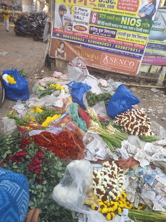 - "The image displays a roadside flower market scene in Bardhaman, India, specifically indicated by visible banners referencing "Bardhaman Birhata Chotulpur Road" and "Vivekananda House, Burdhwan" by FM-NEVVT2, licensed under CC BY 4.0