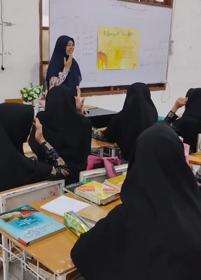 classroom scene where a teacher in a dark blue hijab and floral patterned blouse is standing in front of a whiteboard, apparently teaching a class. The whiteboard has writing and a colorful illustration on it. Several students, all wearing black hijabs, are seated at desks, some raising their hands and laughing. Schoolbooks and other learning materials are visible on their desks. The classroom is brightly lit with natural light coming through windows. There’s a fan on the wall and potted plant on a table near the whiteboard.