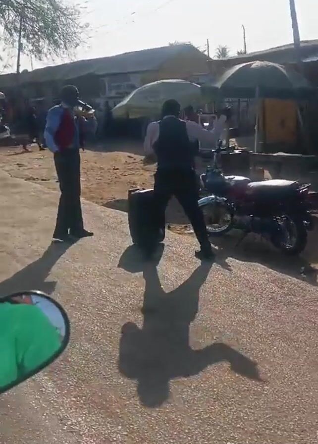 two Black men dancing in the street. One man is wearing a red vest over a light blue shirt and dark pants. The other man is wearing a dark vest over a light pinstripe shirt and dark pants. The man in the red vest is holding a silver microphone and appears to be singing or speaking. They are dancing in front of a red motorcycle and a black plastic barrel with a white "A" on it. Behind them are several street vendors' stalls with umbrellas and various items for sale. The video is shot from the perspective of someone on another motorcycle, as a green-clad arm and side mirror are visible in the lower left corner of the frame. The weather appears sunny and bright.