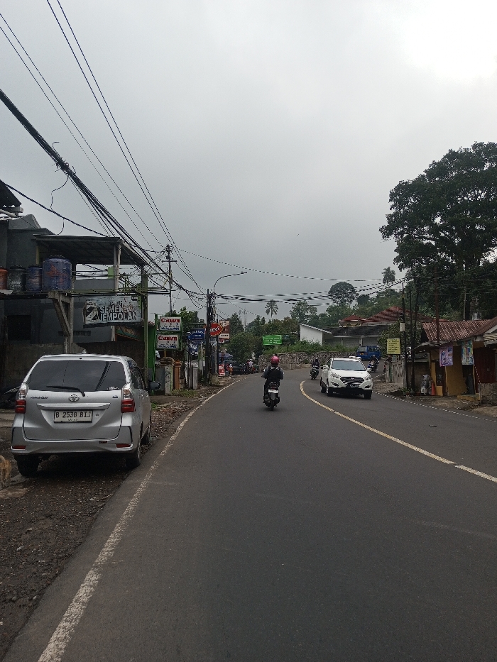 The image depicts a street scene described as being in the city of Sandamal Eliya, Sri Lanka. A silver Toyota Avanza, bearing the Indonesian license plate B 2538 BIJ, is parked on the left dirt shoulder of an asphalt road. A small, light-brown animal is partially visible at the bottom left, near the front of the parked car. Immediately behind the Toyota, a two-story building features a ground level obscured by the vehicle and an upper level with an open-sided structure containing several blue and white barrels. A sign below this structure reads "SEMEN TEMPOLAN" in Indonesian. A dense network of black utility cables and multiple utility poles run along the left side of the road, interspersed with various commercial signs, some displaying the "Canon" logo and other Indonesian text. The asphalt road curves gently to the right, marked with a solid white line on its left edge and a yellow centerline appearing further down the road. A person wearing a red helmet and a dark jacket is riding a black scooter away from the viewer in the middle of the road. In the distance, a white SUV is observed traveling towards the viewer on the right side of the road. On the right foreground, a single-story building with a reddish-brown corrugated roof and light-colored walls displays multiple posters. The background features green, undulating terrain covered in trees and some scattered buildings, all under an overcast, light grey sky.