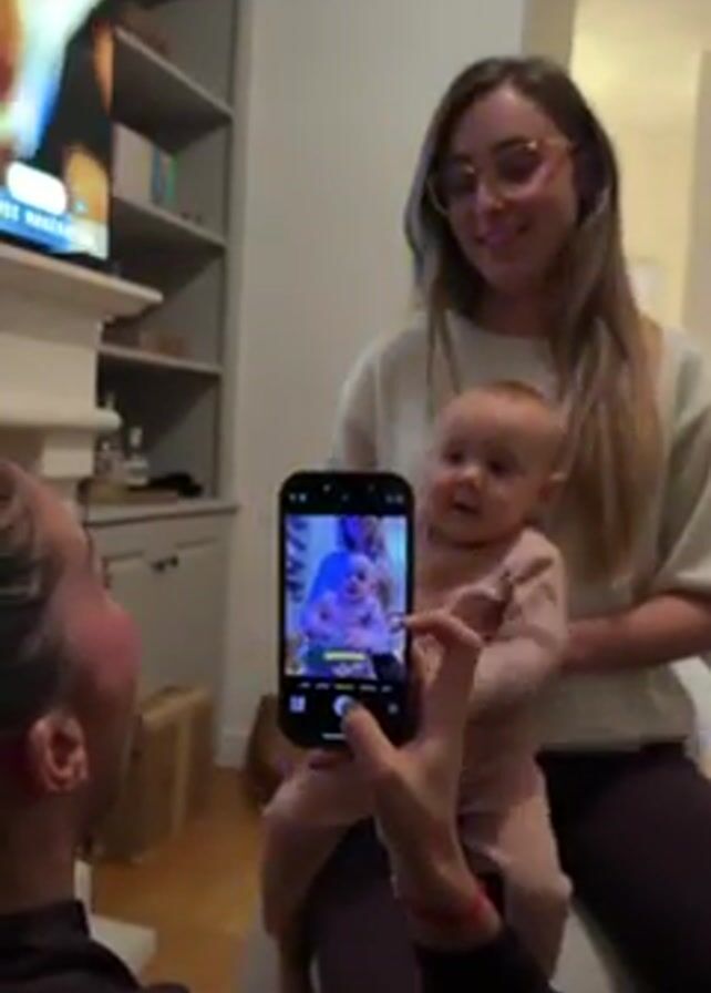 Here's a concise description of the video: Indoors, three women are gathered. One holds a baby in a pink outfit. Another woman holds up a smartphone and takes pictures of the baby and the woman holding the baby. The third woman looks on and also smiles at the baby. A television is visible in the background, along with shelves. The lighting is soft and the atmosphere is warm and intimate.