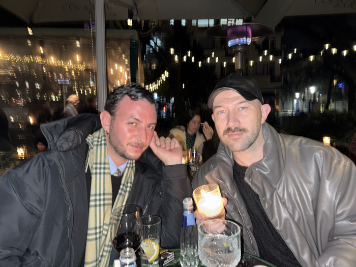 Two men pose at an outdoor table at night. The man on the left wears a black jacket, plaid scarf, and has a dark hair. The man on the right has a black cap, mustache, and a grey leather jacket. A lit candle sits between them. Wine glasses and water bottles are on the table. A heater and strings of lights are visible in the background. Other people are seated behind them.