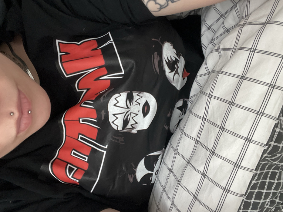 The image depicts a close-up, top-down view of an individual situated in an indoor environment, presumed to be a bed, in the city of Mostar, Bosnia and Herzegovina. The upper torso and lower facial features of the person are visible. The individual is wearing a black t-shirt featuring a repeating graphic of four stylized white faces with black accents, representative of the rock band KISS members' makeup designs, positioned above large, red-outlined white text that spells "KISS." A section of a dark-toned arm with a light-toned, cloud-like or floral tattoo is partially visible on the left side of the frame. The person's lower lip and chin are visible, revealing two silver-toned stud piercings: one located centrally above the upper lip (philtrum) and another centrally below the lower lip (labret). A thin, dark chain-like necklace or choker is visible around the neck. The individual is partially covered by a white duvet or blanket featuring a black grid pattern, characterized by double intersecting lines, which occupies the upper portion of the image. The person appears to be lying down.