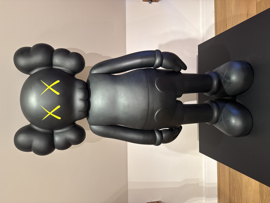 - "A large, matte black KAWS Companion art figure stands centrally on a rectangular black pedestal within an indoor exhibition space in Amsterdam, Netherlands" by FM-j6stS2, licensed under CC BY 4.0
