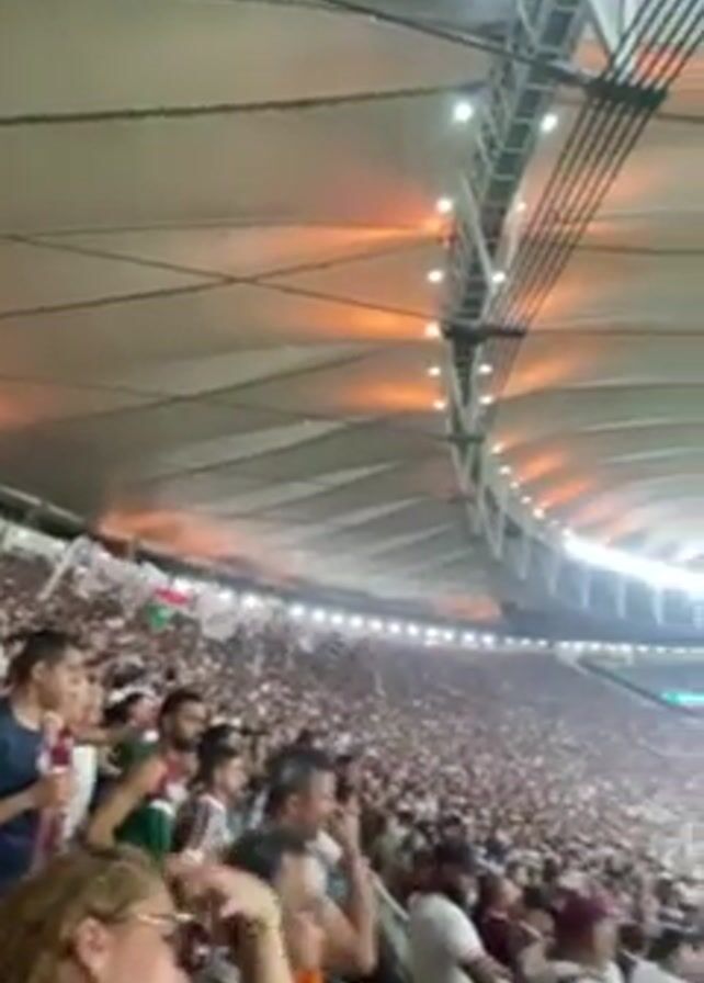 A crowd of people, largely dressed in maroon, white, and green clothing, fills the seats of a stadium for a soccer match. The stadium is capped by a distinctive overhead structure with an illuminated ring running along its perimeter. The interior lighting casts a warm glow on the ceiling. The field is visible below, with players engaged in the game, though details are obscured by the distance and the crowd. The perspective of the video is from a spectator seated within the crowd.