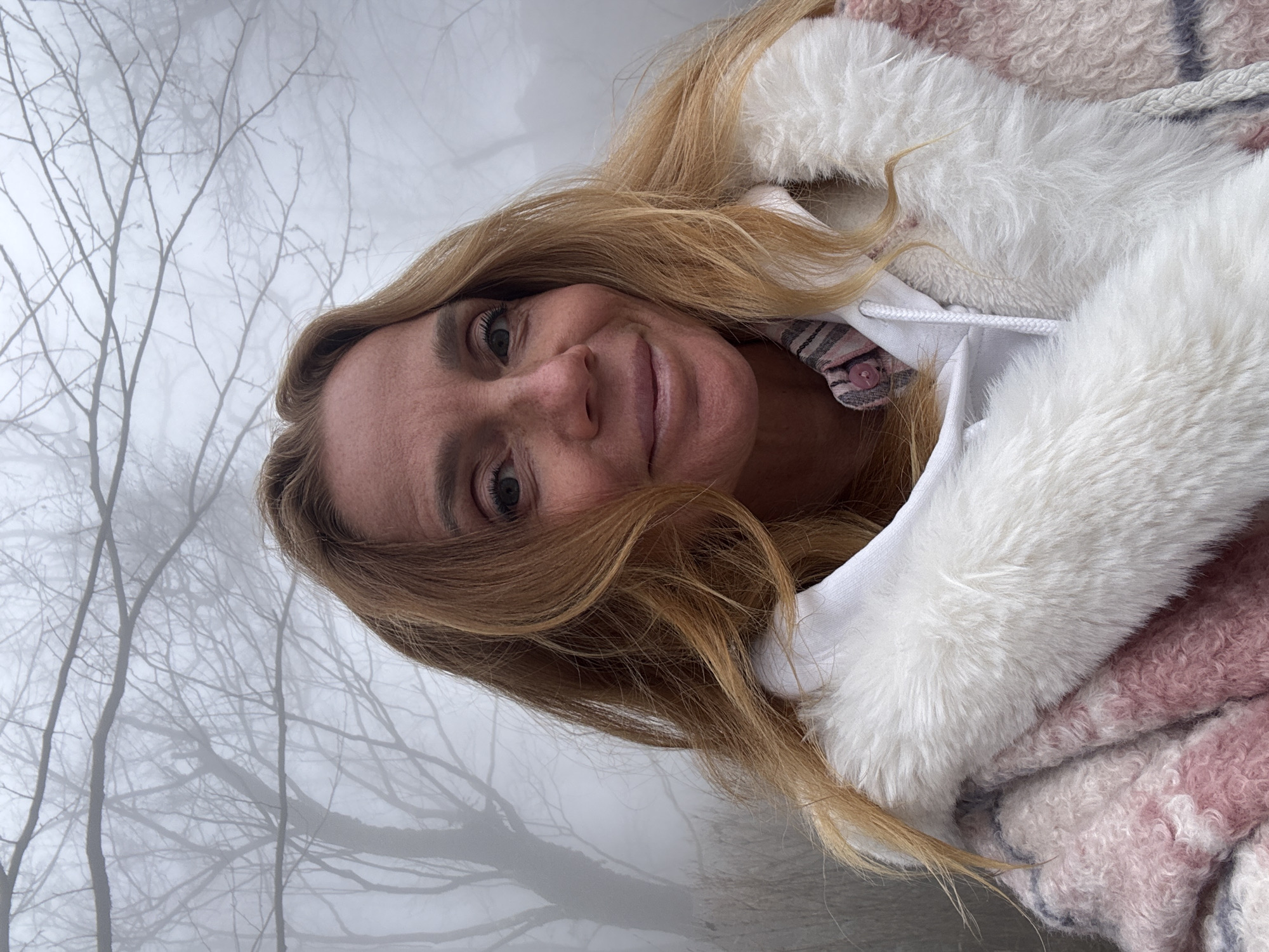 The image displays a close-up selfie of an adult female in Yongding District, China. The woman, with long, wavy, light brown hair and fair skin exhibiting freckles on her nose and cheeks, is positioned centrally, looking directly at the camera with a subtle smile. She is wearing a white hooded sweatshirt underneath a thick, patterned coat. The coat features a prominent white faux fur collar or lapel, and the main body is made of a textured, curly fabric in shades of pink and white, possibly with grey or light blue accents. A pink and white plaid shirt is visible beneath her hoodie. The background is heavily obscured by fog or mist, through which the bare, intricate branches of several deciduous trees are faintly visible, suggesting a cold season. The overall lighting is soft and diffused due to the atmospheric conditions.