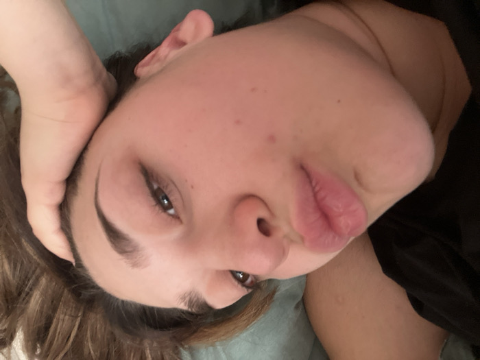 A close-up, tilted portrait shows an individual with brown hair and brown eyes, facing generally towards the camera. Their head is angled, with their left hand resting near the top-left of their head, partially obscuring the forehead and hair. The individual's lips are pursed, creating a pouting expression. Visible skin appears light-toned with minor blemishes on the forehead and cheek. A dark-colored garment is visible over the individual's right shoulder. The background is a soft, light greenish-blue, consistent with fabric such as bedding or upholstery, indicating an indoor setting. This scene occurs within the city of Schiltigheim, France.