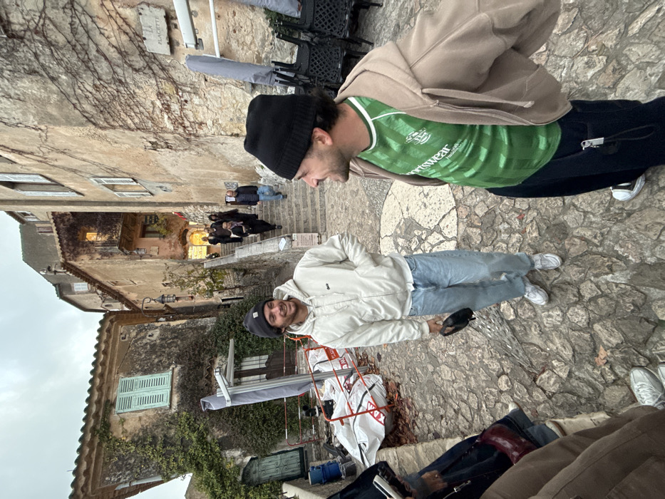 The image captures an outdoor scene in La Placette, Èze, France, depicting a cobbled square and a stone staircase between ancient buildings. In the foreground, two young adult males are positioned, appearing to converse and smile at each other. The male on the left wears a black beanie, a light beige zippered hoodie with a dark emblem, light blue jeans, and white sneakers. He holds a black object in his left hand, which is at his side. The male on the right wears a black beanie, a green short-sleeved t-shirt with "Sportswear" text, an open tan zippered hoodie, dark pants, and white sneakers with dark accents. A keychain with a white tag is clipped to his right pant pocket. In the mid-ground, a stone staircase ascends between two multi-story buildings. Several indistinct individuals are visible on these steps, moving upwards. The building to the left of the staircase features light blue shutters and ivy climbing its stone facade. To the right of the staircase, a light-colored building displays a sign reading "LA PLACETTE" and has dry vine growth. Stacked dark outdoor chairs and a folded umbrella stand are visible against this building. The ground is paved with irregular cobblestones. To the immediate left, partial views of another person's lower body and an arm holding a white electronic device are visible. Adjacent to them are temporary construction barriers with white sheeting covering what appears to be debris or materials, along with some fallen leaves and a blue container. The lighting suggests an overcast day or late afternoon, with some artificial illumination from streetlights and building interiors further up the steps.