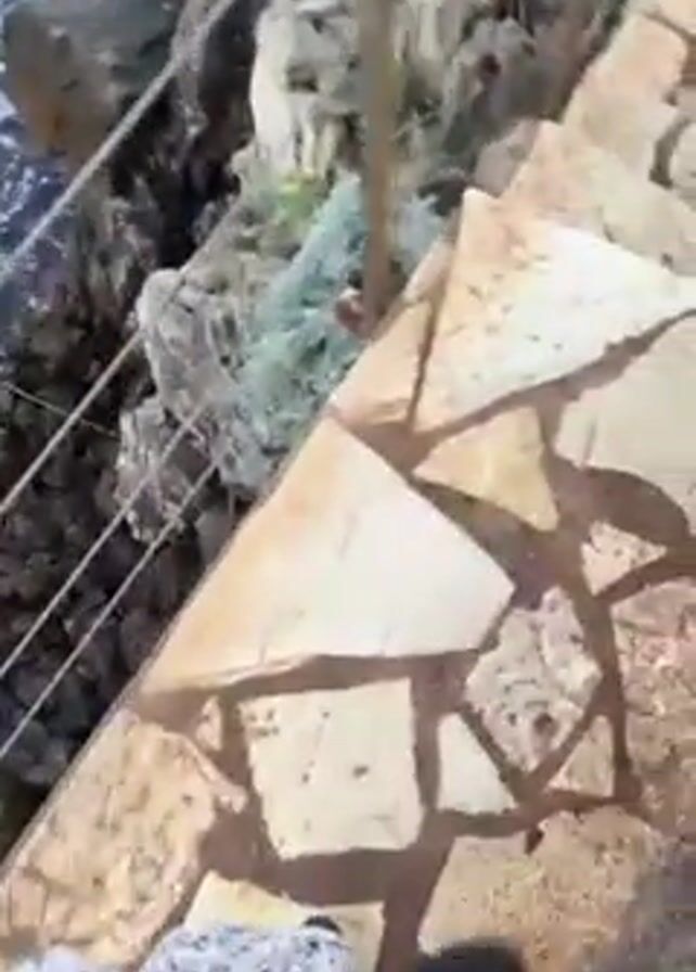 A person walks down a stone staircase, with a metal and wooden railing on one side, leading towards a rocky coastline. The ocean waves crash against the rocks below. Another person walks slightly ahead on the stairs. The day appears overcast.