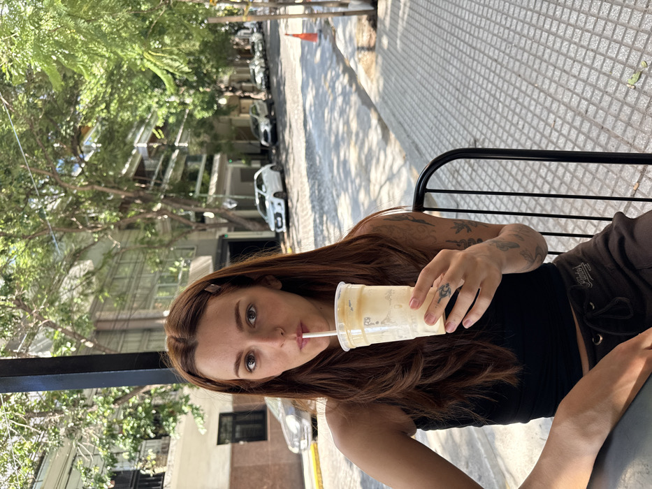 A young adult female with reddish-brown hair, wearing a black tank top and dark brown pants, is seated outdoors and looking directly at the camera. She holds a clear plastic cup containing a light-colored, frothy beverage with a white straw, from which she is actively drinking. Tattoos are visible on her left arm and right ring finger. She is positioned in a black metal chair on a checkered tiled sidewalk. The scene is a tree-lined street in Buenos Aires, Argentina. The street features a cobblestone surface (adoquines) and is bordered by multi-story buildings with balconies and varied architectural styles. Several vehicles are parked along the street, including a white hatchback and a silver sedan. Sunlight illuminates the scene, casting shadows, and an orange traffic cone is visible on the sidewalk to the right. The urban environment, including the cobblestones and building architecture, is consistent with established neighborhoods within the city, such as Palermo or Recoleta.