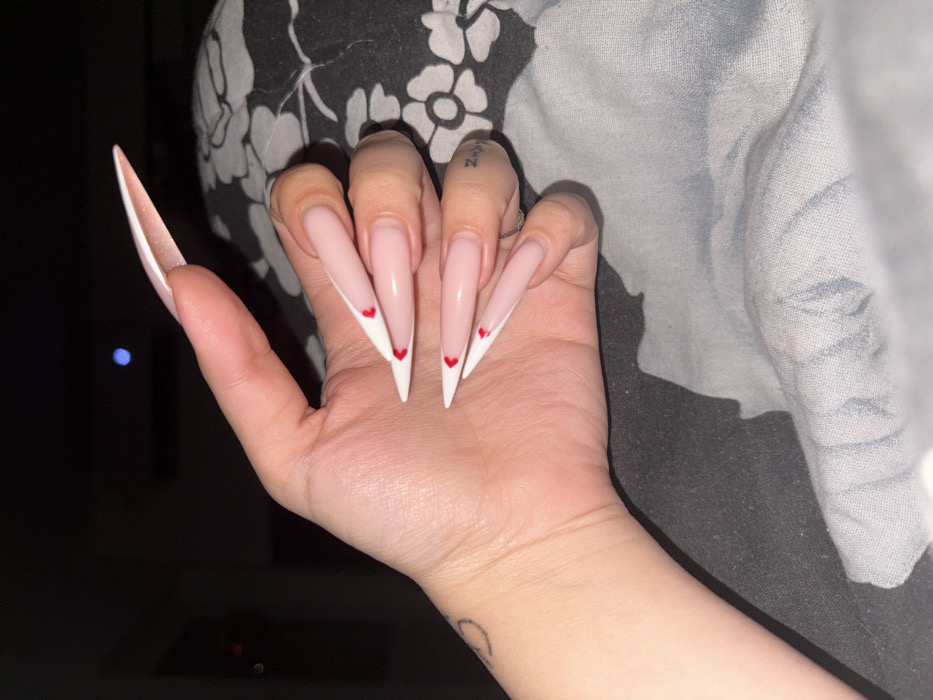 The scene depicts a close-up of a human left hand, presented in a dimly lit indoor environment in the city of Ivanovo, Bulgaria. The hand, exhibiting light to medium skin tone, features five visible fingernails which are long, artificial, and shaped in a sharp stiletto or almond style. Each nail displays a light pink/nude base, a distinct white V-shaped tip, and a small red heart emblem centered at the tip's apex. A faint, dark tattoo is visible on the inner wrist. A thin metallic ring adorns the ring finger, which also has a small dark mark or tattoo on its side. The hand rests on a dark fabric surface patterned with faded lighter floral or abstract designs. The background is blurred and dark, with subtle indications of artificial light sources, including a faint blue circular light and a smaller red light point.