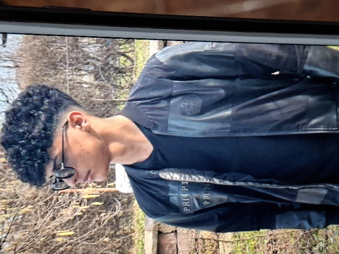 An image captured from a vertical screen displays a young male subject in profile, looking to the left