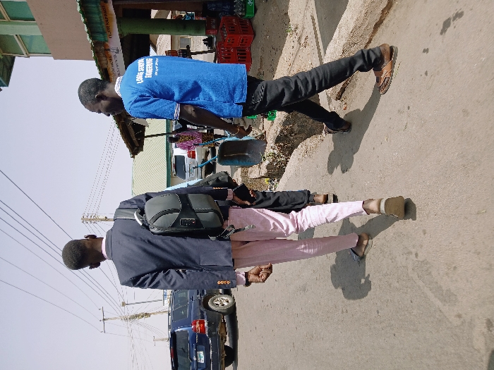 This image depicts a street scene in the city of Kungulu School, Zambia, under clear daylight conditions with strong sunlight casting distinct shadows. The foreground features three individuals walking away from the camera on an asphalt road. The person on the far left wears a dark blue blazer, light pink trousers, and light-colored sandals, with a black and gray backpack slung over their right shoulder. They hold a dark object in their left hand. To their right, a second person wears a blue short-sleeved t-shirt with "LONG SERVING ENGINEERING" partially visible in white text on the back, dark trousers, and brown leather sandals. A third individual, partially obscured between the first two, is also walking, wearing dark trousers and light-colored shoes or sandals. The right side of the road features a concrete curb bordering a dusty area with various structures appearing to be shops or stalls. Red plastic crates are stacked on the ground, and a blue wheelbarrow is visible near the curb. A person in a pink patterned garment stands further back near these structures. The left side of the road shows a dark blue SUV, possibly parked or moving slowly, and a utility pole with multiple overhead wires against a light, cloudless sky. Another lighter-colored SUV is visible in the background further down the street.
