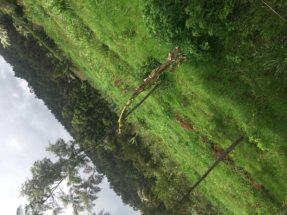 The image displays a sloping, verdant outdoor landscape in Ndeiya, Kenya, under an overcast sky. The foreground and midground consist of a hillside covered in vibrant green grass and interspersed with various herbaceous plants and smaller shrubs. On the left, several young trees with slender trunks and light green canopies are present. A desiccated or decaying plant stem, consistent with a banana plant, stands upright in the mid-right. The background features a dense, dark green forest or wooded area ascending the slope. The sky is uniformly grey with cloud cover. No individuals, animals, or man-made structures are observed.