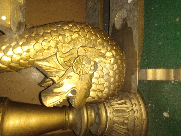 The image depicts a detailed close-up of an ornate, gold-colored decorative element, consistent with the interior decor of the **Teatro Nacional de Costa Rica** in Ciudad de San José, Costa Rica. The central subject is a gilded, sculptural representation of a stylized dragon or makara, oriented vertically. This creature features an open mouth revealing teeth, a distinct eye socket, and a prominent floral motif on its neck/shoulder. Its body is elaborately covered with overlapping scales, indicative of fine craftsmanship. To the immediate left, a portion of a fluted, gold-colored column base or pedestal is visible. Below the creature, a horizontal golden ledge supports its base. This ledge exhibits visible dust and minor debris. Below the golden ledge, a dark green, textured surface, likely carpet or felt, occupies the lower portion of the frame, with a vertical golden stripe running through it. The background behind the gilded elements is a plain, light brown or beige wall. All visible surfaces, particularly the horizontal ones and the crevices of the ornamentation, show a fine layer of dust, suggesting the age and stationary nature of the objects in an indoor environment. No individuals are present in the scene.