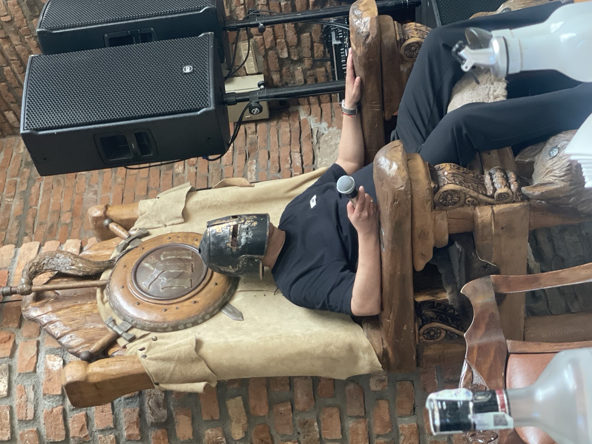 The image captures an unusual scene, possibly staged, in a setting that suggests the city of Lukovit, Bulgaria. A person wearing a helmet is lying on a wooden structure resembling a throne or seat. The throne-like structure is adorned with a shield, swords, and draped with what appears to be tanned animal skin, perhaps a goat or sheep hide. The person lying on the structure is dressed in black. They are holding a microphone. Another person, dressed in black pants, is seated on the right side of the image. A bottle is partially visible at the bottom right. The setting seems to be a room with brick walls. Mounted speaker systems are also visible near the top left of the frame. The overall impression is of a theatrical or performance-based setup.