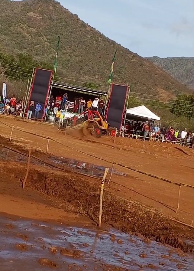 n off-road vehicle navigating a muddy track during an event. The track is composed of red dirt and mud, with a large, partially flooded area in the foreground. A yellow and red off-road vehicle is seen driving through the mud. Behind the track, there is a raised platform structure with a crowd of people. Two large, vertical banners flank the structure. A white tent is positioned to the right of the platform. A safety barrier made of stakes and yellow caution tape surrounds the track. In the background, a green, mountainous landscape can be seen under a clear sky. People stand and observe the event.