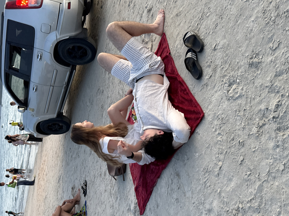 The scene depicts a beachfront area at Cenang Beach, Malaysia, under clear daylight conditions. In the foreground, a male and a female are situated on a rectangular dark red blanket placed directly on the sand. The male is lying supine on his back with his head resting on his bent left arm, while his right arm is also bent with the hand near his head. He wears a light-colored, possibly white or light grey, long-sleeved shirt and striped shorts. The female is seated facing left, with her back against the male's chest or shoulder area. She wears a white top and her legs are bent, with her bare feet on the blanket. Her long, light brown hair cascades over her shoulders. A small container with what appears to be fruit or food is visible on the blanket between them. To the right of the blanket, a pair of black Adidas slide sandals with white stripes rests on the sand. A brown shoulder bag is partially visible behind the female. In the midground, other individuals are visible further down the beach and in the shallow water, some standing, some walking. To the right, a silver Nissan X-Trail SUV is parked on the sand, facing generally left. Its rear passenger door is visible, and the vehicle appears slightly worn with some scuff marks along the lower body. The ocean water stretches into the background, with distant land features or islands faintly visible on the horizon. The sand is light-colored and textured, indicating a natural beach environment. The overall lighting suggests either late morning or early afternoon.