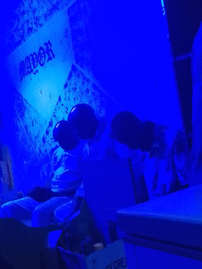 Three figures wearing white overalls and black spherical head coverings sit in a room bathed in blue light. The word "MAYOR" is visible on a wall in stylized lettering with apparent splatter marks. A box with partial text "RY CRE" is visible at the bottom. The setting appears theatrical or a set, due to the artificial lighting and distinct costume-like clothing of the figures.