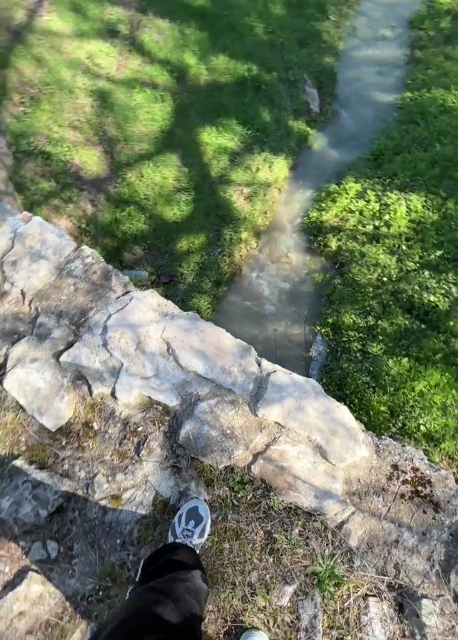 person standing on a stone structure looking down at a narrow stream