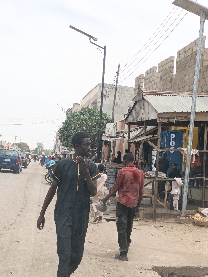 The image depicts a daytime street scene in Hotoro North, Nigeria, under an overcast sky. The foreground features an unpaved, light-colored dirt road with an irregular surface, including a visible depression on the right. Two male individuals are prominent in the foreground. On the left, a man with dark skin, wearing a dark blue or black traditional tunic and trousers with yellow trim, walks towards the viewer's right while looking left, his right hand near his chin. In the mid-ground right, a second man with dark skin, dressed in a red plaid long-sleeved shirt and dark trousers, walks away from the viewer, carrying a light-colored pot in his left hand. He wears light-colored sandals. Along the right side of the street, a series of makeshift market stalls or shops with corrugated metal roofs and wooden supports are visible. Inside and around these stalls, several other individuals, mostly males, are seated or standing. One stall incorporates a blue container labeled "POS" (Point of Sale) and has a yellow section. White fabric is draped near one stall. In the background, the unpaved road continues, with a blue sedan visible on the far left and a motorcycle further down the street. Several pedestrians are also present in the distance. The backdrop includes various buildings: a multi-story building with a light-colored facade, an unfinished concrete block structure, and a prominent wall made of exposed concrete blocks. Utility poles with overhead wires traverse the scene, and two black solar-powered streetlights are visible, one in the mid-ground center and another further right. Green foliage from a large tree is visible between buildings in the mid-ground left.