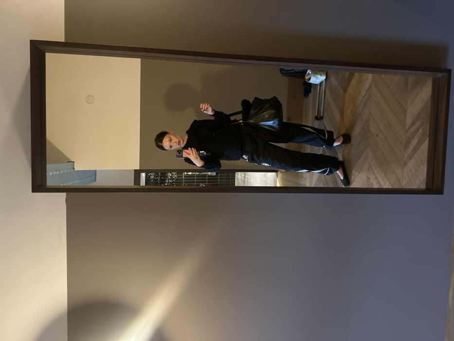 The image captures a full-length mirror selfie of a female individual in what appears to be a hotel room or serviced apartment. The subject, a female with dark hair pulled back, light complexion, and neutral expression, is reflected in a large, dark-brown framed mirror. She is wearing a black long-sleeved top, black tracksuit bottoms with white diagonal stripes, and black flat shoes. In her left hand, she holds a smartphone with a pink case, seemingly taking the photograph. Her right hand holds a large black leather shoulder bag, which has a fluffy black accessory attached near the strap. The reflected interior reveals a room with a contemporary design. The floor is light-colored herringbone parquet wood. The walls are designed with a two-tone scheme: a darker brownish-grey on the lower half and a lighter cream or beige on the upper half. To the subject's right on the reflected floor, a silver object resembling a crutch or stand is visible, alongside a small, light-colored patterned bag. In the background reflection, through an opening or doorway, glimpses of another area with dark, possibly metallic, architectural detailing and a darker floor are seen. A pale blue or light grey ceiling is also reflected. The wall on which the mirror is mounted is a plain brownish-grey, displaying a distinct, elongated bright light reflection to the left of the mirror frame. The interior design, featuring herringbone parquet flooring, two-tone walls (dark brownish-grey lower, light cream/beige upper), and a dark-framed mirror, is characteristic of a modern boutique hotel or upscale serviced apartment. Based on these contemporary design elements, the scene is situated within such an establishment in Manchester, United Kingdom.