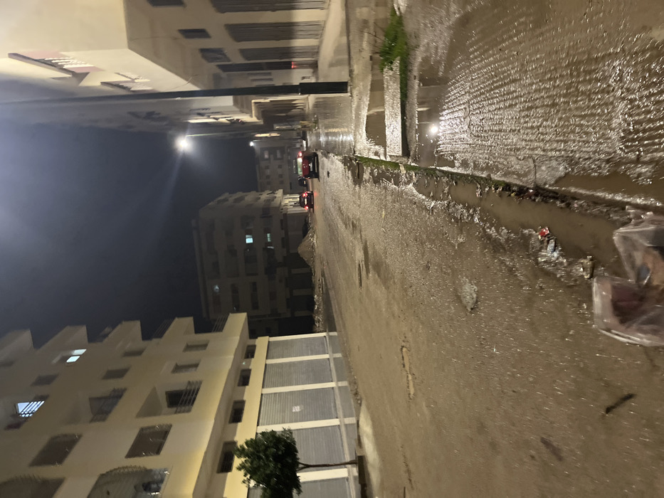 A nighttime view down a wet city street lined with tall apartment buildings. The road is paved and reflects the streetlights, showing standing water in places. A small tree stands in front of a gray wall on the right. Some litter and debris are visible along the curb. Two cars with red taillights are further down the street. The sky is dark, suggesting a late hour.