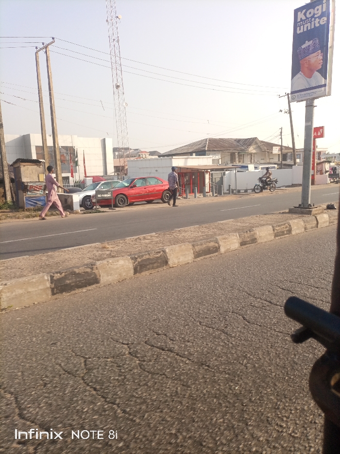 A street scene with pedestrians walking along the roadside. Two cars, one red and one white, are parked by a building that has a "No Parking" sign in front of it. A motorcycle drives by on the road. A tall advertisement for "Kogi must unite" stands to the right, and a tower is visible in the background. The road in the foreground shows significant wear and tear. An Infinix NOTE 8i watermark is visible in the lower-left corner.