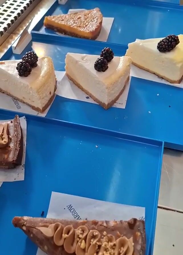 The camera pans across a display case of various pastries and desserts. Slices of cheesecake with blackberries, caramel-topped desserts, nutella-swirled pastries, and bite-sized squares covered in coconut flakes are on display. The pastries are arranged on bright blue trays, separated by white pieces of paper. The display case is stainless steel, and a patterned tile floor can be seen in the background.