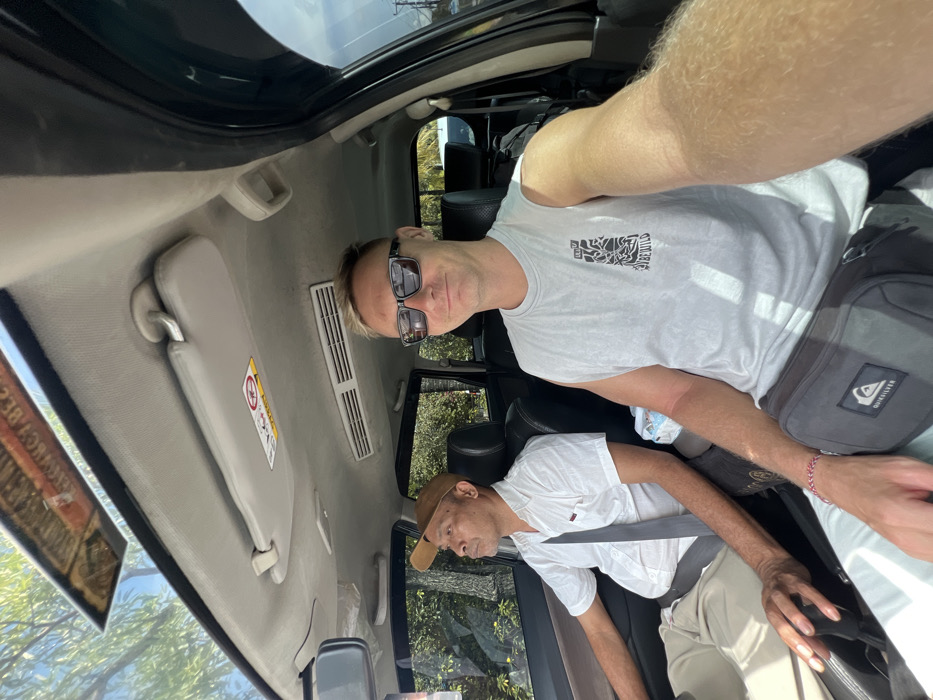 Two men are in a car. One is wearing sunglasses and a gray t-shirt, the other wears a white shirt and khaki pants. The camera's angle makes the scene appear upside down. The interior of the vehicle is visible, including the sun visor and air conditioning vents. A bag with the Quiksilver logo rests beside the man in the grey t-shirt. Trees are visible through the car windows.
