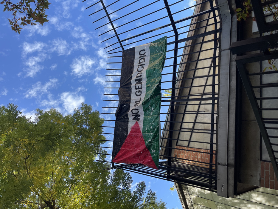 - "An outdoor scene in Madrid, Spain, features a weathered banner resembling the Palestinian flag draped over a black metal security fence" by FM-Uiavu2, licensed under CC BY 4.0