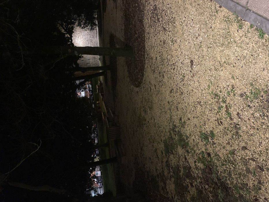 A gravel-covered area is partially illuminated. To the left, trees cast deep shadows, obscuring a distant cityscape. Some wooden pallets are partially visible between the trees. The ground cover transitions from dense gravel to sparser patches with some green vegetation near the upper right corner. A concrete border runs along the top edge.