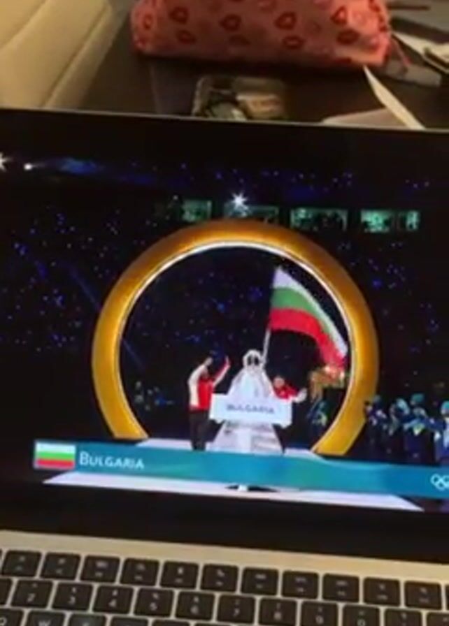 laptop screen displaying the Bulgarian delegation entering the stadium at what appears to be an Olympic Games opening ceremony