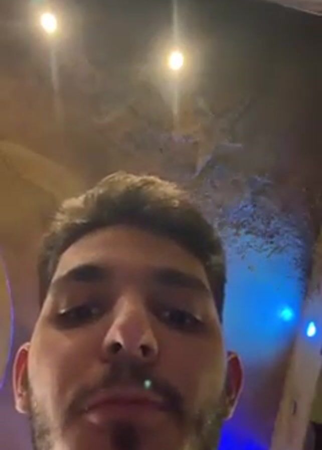 A head-on selfie video shows a person with brown hair and a beard looking directly at the camera. The background reveals a ceiling with two bright white lights and some blue LED lights. There's a star shape visible on the ceiling. Music plays audibly.