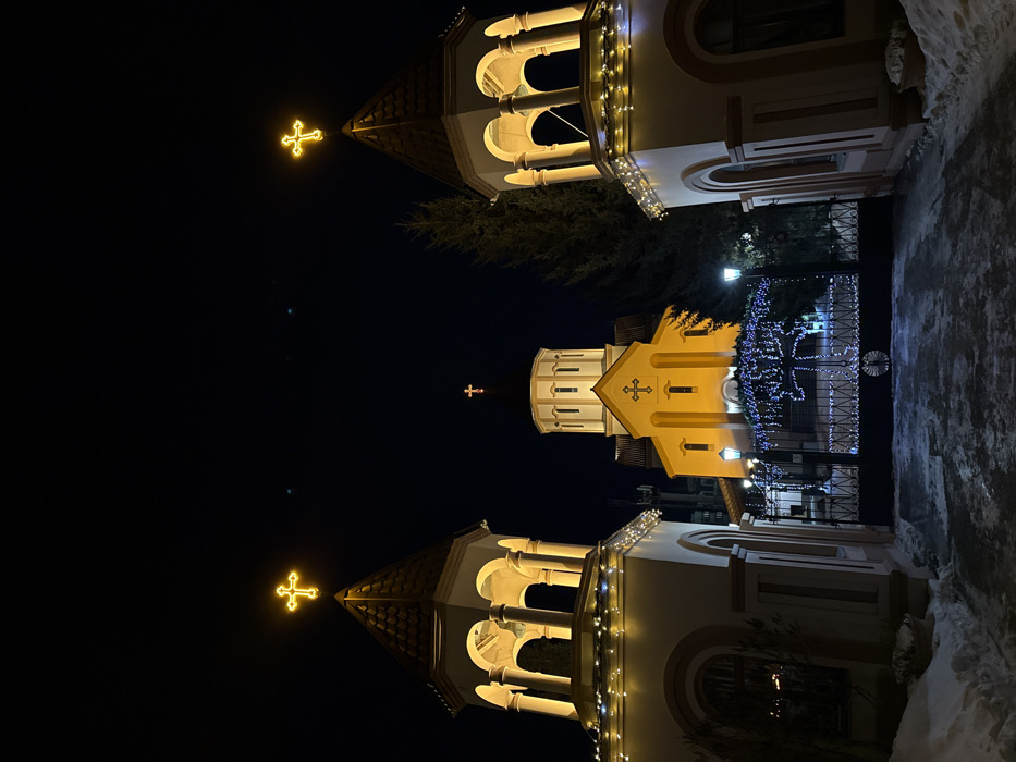 This image captures the Surb Sarkis Armenian Apostolic Church complex located at Borodina St, 28, Krasnoyarsk, Krasnoyarsk Krai, Russia, 660049, during nighttime