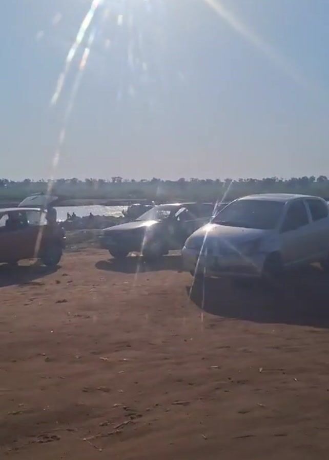 line of parked cars on a brown, sandy area near a body of water under a bright, sunny sky. The cars are a mix of colors and models, and the sun is reflecting brightly off their surfaces. In the distance, there appears to be a gathering of people along the shore of the water. The land is mostly barren with sparse patches of vegetation.