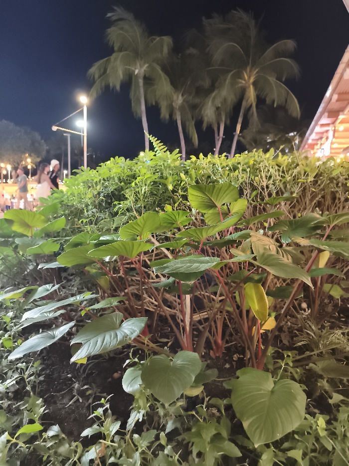 This image depicts an outdoor, nighttime scene in Baan Chaweng, Thailand. The foreground is dominated by lush tropical foliage, including large-leafed plants with prominent green leaves and reddish-brown stems, interspersed with smaller green groundcover. In the midground, a dense, manicured green hedge acts as a visual divider. Beyond this hedge, a tall lamppost with two bright white lights illuminates the area. Several indistinct human figures are visible in the blurred background, suggesting pedestrian activity. Further in the background, a cluster of tall palm trees is silhouetted against a dark night sky. To the far right, a portion of a building with an illuminated, possibly tiled roofline is present. The scene is artificially lit, casting highlights on the vegetation and illuminating the background elements.