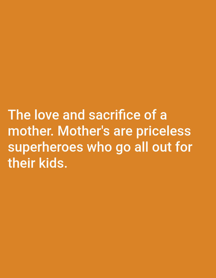The image displays white sans-serif text centered on a solid orange background. No people, objects other than text, or specific environmental features are depicted. The text reads: "The love and sacrifice of a mother. Mother's are priceless superheroes who go all out for their kids." The location is not depicted in the image and cannot be determined.