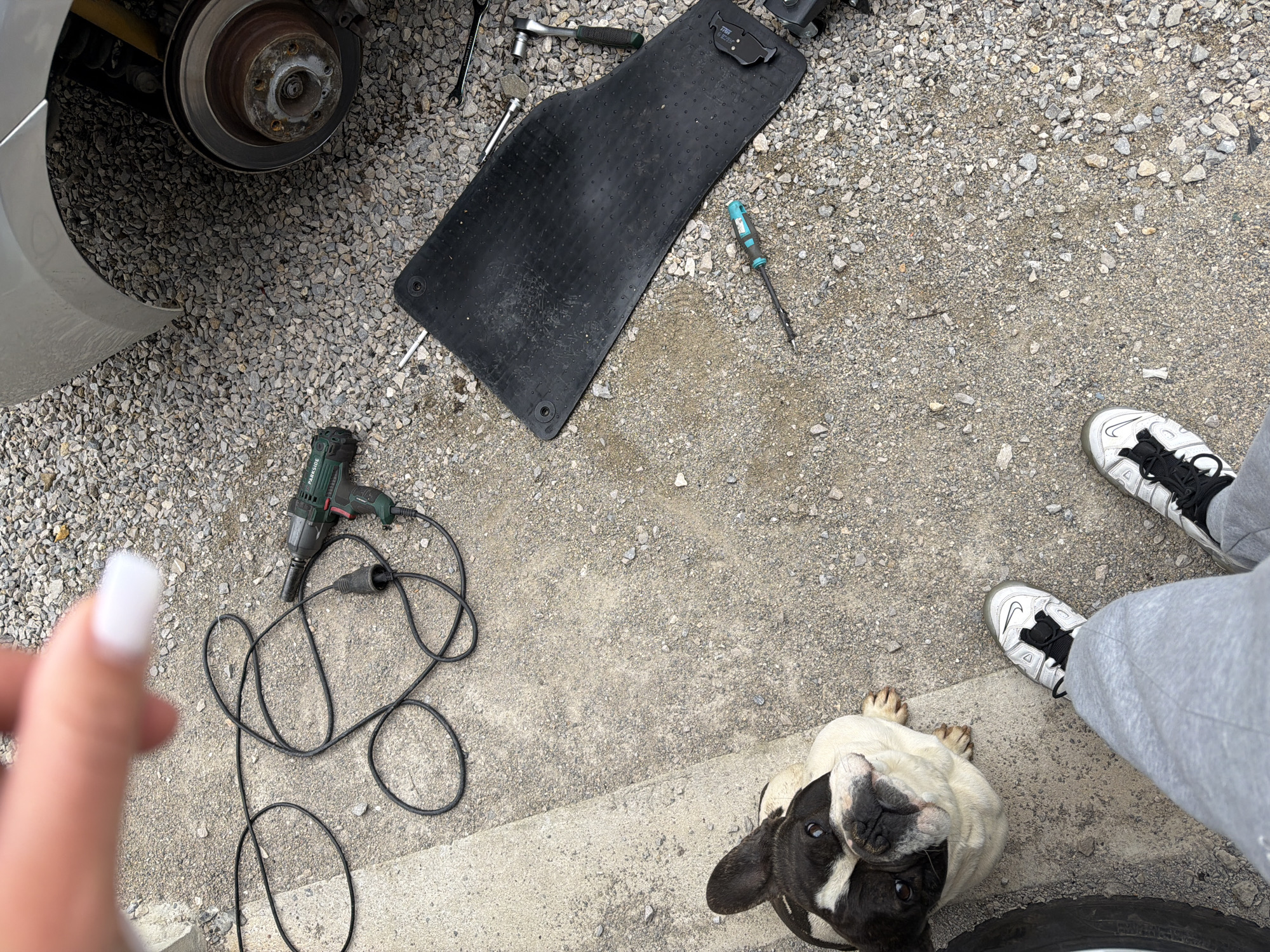 n outdoor scene on a gravel and concrete surface, likely a driveway or repair area, in Balinovtsi, Bulgaria. A car with its wheel removed, exposing the brake rotor, is in the upper left corner. Various tools, including wrenches, a screwdriver, and an impact wrench with its power cord, are scattered around. A black car mat is also visible. A dog, a French Bulldog, is looking up toward the camera near the bottom. A person's legs, wearing grey sweatpants and white sneakers, are in the lower right corner. A person's hand with a painted nail is in the lower left.