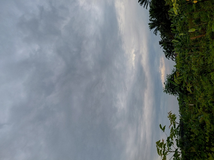 Overcast sky dominates the frame, filled with textured, gray clouds. A narrow strip of greenery lines the right edge, featuring various trees and foliage, some appearing banana plants. A hint of golden light breaks through the clouds near the horizon, suggesting either sunrise or sunset. The photo is oriented vertically.