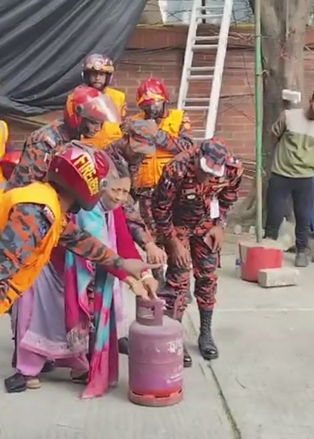 group of people, many wearing firefighter uniforms, gathered around a large, upright gas cylinder outdoors. A woman in casual clothing is interacting with the top of the cylinder, seemingly under instruction or guidance from the firefighters. Some individuals are observing closely. The setting appears to be a training or demonstration area, with a ladder visible in the background and an assortment of other people watching from the periphery.